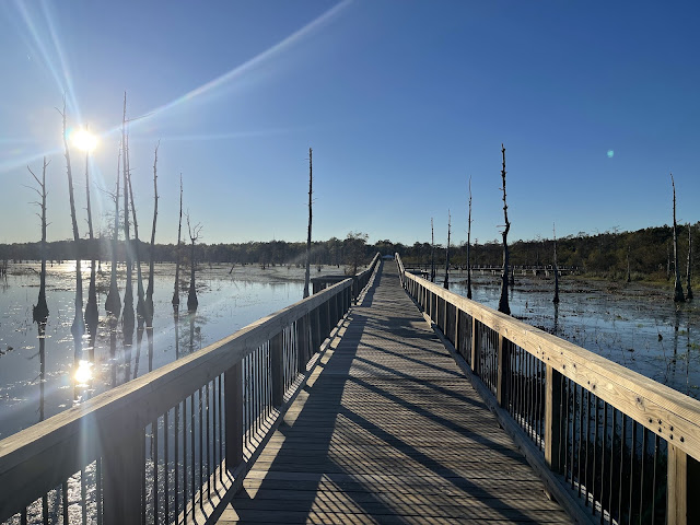 When I arrived home, I had one clear goal: I don't ever want to feel the way I did when I was driving to Poverty Point again. And in the last seven years, save one dark night in 2019, I have not. In fact, I have felt progressively better every year since then, my mind and spirit progressively stronger. Thus, when my wife told me in early March of this year, "I want to talk to you about something," I wasn't completely destroyed by the result of that conversation. I grieved for a few weeks, and then my mind turned optimistically toward the future. Moments have been, like Geometry tests, difficult, particularly when I found myself working 80 hour weeks throughout this past summer, but I've been feeling great about life. As this year neared its end, I decided I should take one of my hiking trips to clear my head and reflect. I looked through lists of state hiking trails I haven't yet visited, and settled upon Black Bayou Lake National Wildlife Refuge, near Monroe, Louisiana. I picked a date, took off of work, made sure my son had a ride home from school, and eagerly awaited the trip. The day finally came, I dropped my son off at school, and hit the road. What happened next makes no logical sense.